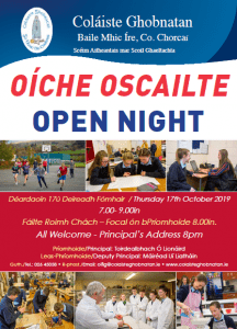 Beidh an Oíche Oscailte/Cláraithe againn ar an Déardaoin, 17ú Deireadh Fómhair ó 7.00 i.n. go thart ar 9.00 i.n. Tugann an oíche seo seans do thuismitheoiri teacht agus bualadh le foireann an Choláiste. Tugann sé seans siúl timpeall chun áiseanna agus fearas an Choláiste a fheiscint agus bíonn/beidh seans bualadh liomsa ag an seisiún eolais. Moltar do thuismitheoirí na foirmeacha iarratais a chomhlánú ar/nó roimh an oíche seo.